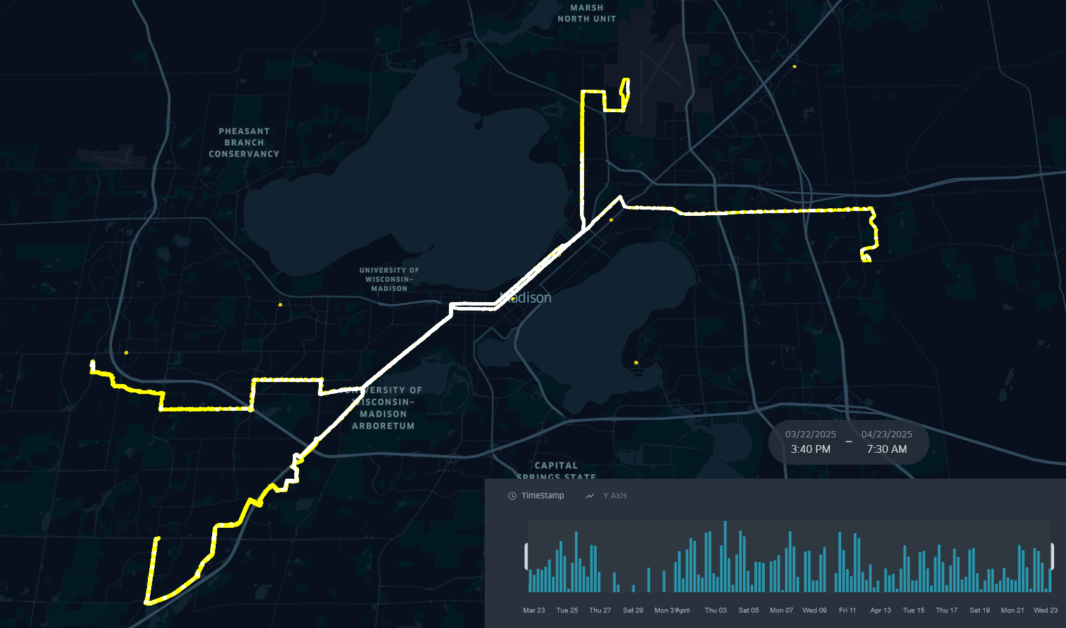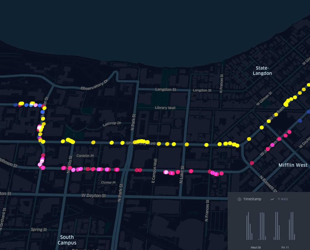 "While Madison has an impressive bus system for the size of the city, I have more than once waited well past when the bus was scheduled to arrive and at time found the bus packed so full that it drives past without stopping. With this project, I set out to see for myself where and when buses were full on each route. I collected the data myself from the Madison Metro Transit API every twenty seconds for weeks, stored an collated that data, and finally visualized via multiple python scripts. I uesd an open source python API, KeplerGL, to create the dynamic, interactive, animated maps. These visualizations allow for easy extraction of insights about the Madison bus system. You can easily see the daily flux of commuters in and out of the city before and at the end of the workday, as well as the rush filling the buses to capacity many days."